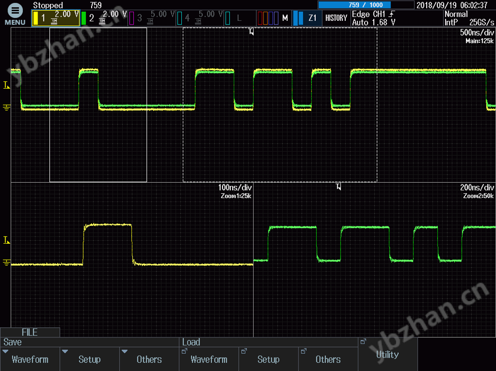 獨立的縮放處理器即使在500兆點時也能快速放大波形數據。雙縮放可以輕松查看兩個時間點的事件,選擇要顯示的特定輸入通道,甚至可以自動向前或向后滾動。縮放搜索可查找邊緣,圖型,脈沖寬度或超時條件,以便更輕松地定位感興趣的數據。