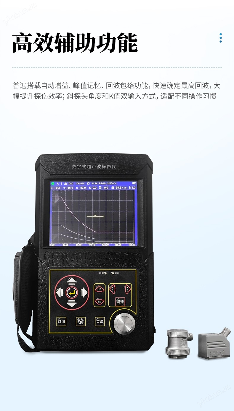 3、自動校準:一鍵式自動校準,操作便捷,自動測試探頭的“零點”、“K值”、“前沿”及材料的“聲速”;