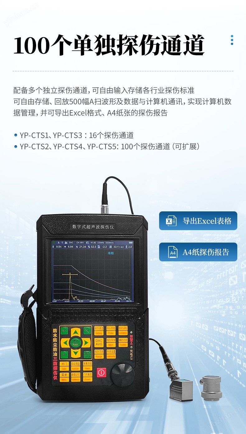 8、100個單獨探傷通道(可擴展),可自由輸入并存儲任意行業的探傷標準,現場探傷無需攜帶試塊;