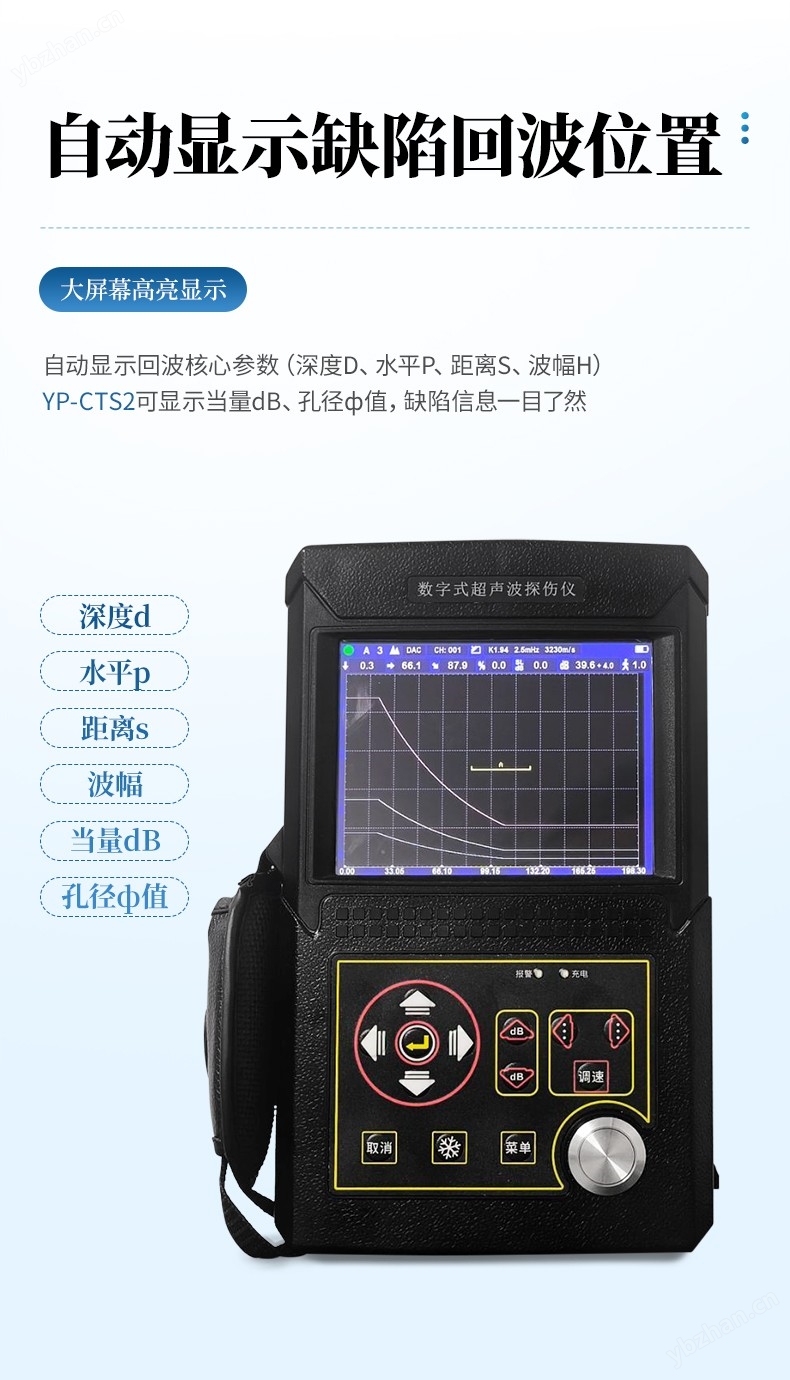 4、自動顯示缺陷回波位置(深度d、水平p、距離s、波幅、當量dB、孔徑ф值);