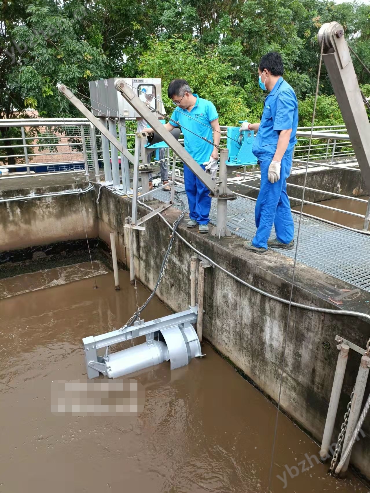 將污泥回流泵水平吊起,并沿導管垂直下滑。泵沿導管滑下并自動與出水管自動耦合。保證進口錐管的法蘭在導向處與出水管處于正確位置。升降1至2次,檢查是否靈活自如。污泥回流泵正確就位后,使手搖葫蘆鋼絲繩處于松弛狀態。