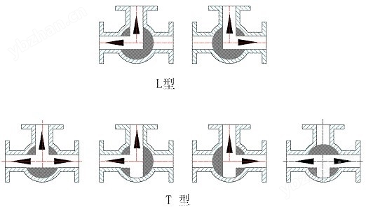 3、三通球閥一般采用兩面閥座結(jié)構(gòu),如流向圖A所示兩種工況。選用兩閥座L型結(jié)構(gòu)即BQ44型。流向圖B中①和④兩種工況亦可選用兩閥座T型結(jié)構(gòu)即BQ45型。流向圖B中②和③兩種工況必須選用四閥座T型結(jié)構(gòu)即BQ45型。其余工況也可選用四閥座結(jié)構(gòu),但應(yīng)在訂貨合同中注明閥座結(jié)構(gòu)。如閥門有其它要求請參閱樣本《球閥的型號編制方法》填寫相應(yīng)的要求代號。
