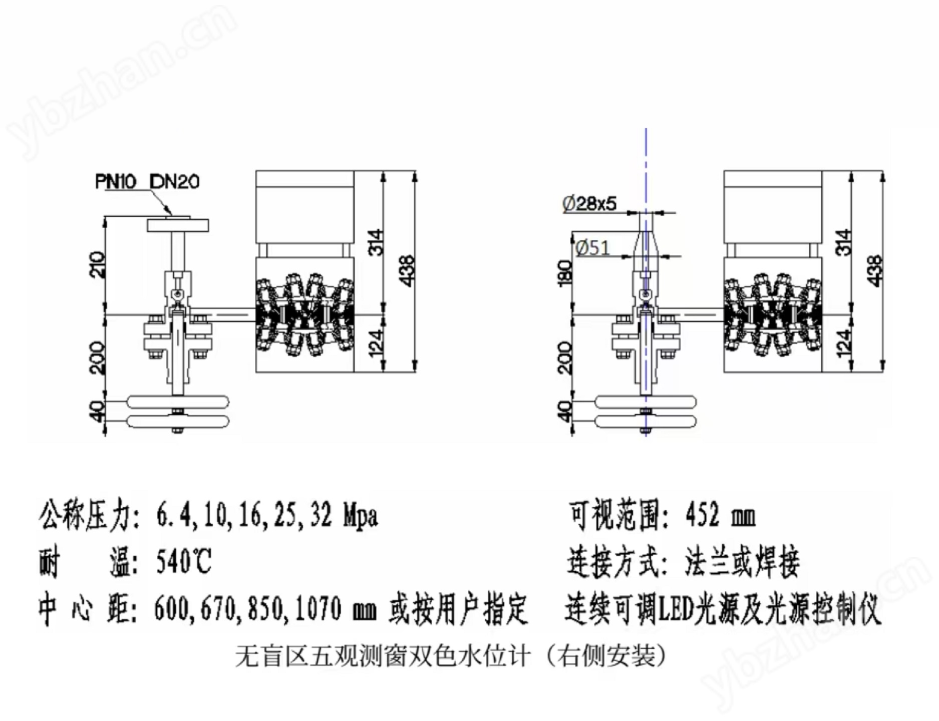 水位計本體頂部設(shè)置了一個臥式冷凝器,與罐體導(dǎo)管及二排窗口的通孔相通,構(gòu)成一個回路。當飽*和蒸汽流經(jīng)冷凝器時,變成大量的冷凝水順窗口表面沖洗觀察窗,將觀察窗口云母上沾附的污垢帶走,使窗口不易掛垢,不但可以達到顏色清晰效果,而且能夠減少排污沖洗的次數(shù),同時也提高了窗口備件的使用時長。