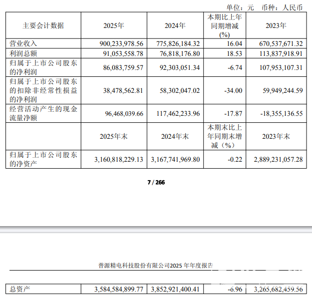 利潤端方面,公司2025年實現歸屬于上市公司股東的凈利潤8608.38萬元,同比減少6.74%;基本每股收益0.44元,同比下降10.20%。凈利潤小幅下滑主要受兩方面因素影響:一是公司為維持技術領先優勢,持續加大研發投入,全年研發投入總額達2.26億元,同比增長9.30%,研發投入占營業收入比例為25.09%,雖較上年略有下降,但仍維持行業高位,研發人員薪酬、研發物料消耗及設備折舊費的增加短期內對利潤形成一定侵蝕;二是所得稅費用同比增加2045.47萬元,主要系子公司所得稅優惠政策調整及遞延所得稅資產確認等因素導致,進一步影響了凈利潤水平。值得注意的是,公司扣除非經常性損益后的凈利潤為3847.86萬元,同比下降34.00%,主要因營業外支出同比減少使得非經常性損益增加,拉低了扣非后盈利表現。