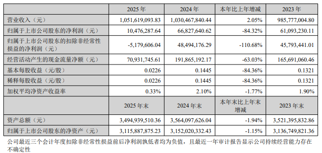核心財務數據顯示,2025年公司實現營業總收入10.52億元,同比僅增長2.05%,增速較2024年明顯放緩,增長動能疲弱;全年歸母凈利潤僅為1047.63萬元,同比大幅下降84.32%,盈利規模近乎“腰斬再腰斬”;扣除非經常性損益后的凈利潤為-517.96萬元,同比大幅下降110.68%,由盈轉虧,標志著公司主營業務已喪失盈利能力。與此同時,公司整體經營質量持續下滑,毛利率同比大幅下滑8.47個百分點至28.16%,凈利率更是暴跌至0.94%,較上年同期下降5.54個百分點,盈利空間被嚴重擠壓;經營活動產生的現金流量凈額為7093.17萬元,同比大幅下降63.03%,現金流收縮幅度遠超營收增速,資金回籠能力顯著減弱。利潤分配方面,公司擬向全體股東每10股派發現金紅利0.05元(含稅),分紅力度較往年大幅縮水。?