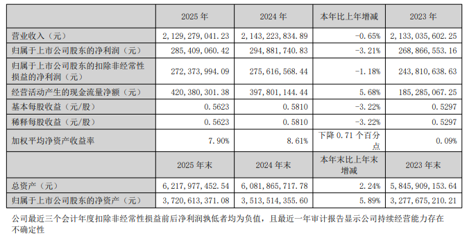 2025年,江蘇神通實現營業收入21.29億元,同比微降0.65%;歸屬于上市公司股東的凈利潤2.85億元,同比減少3.21%;扣除非經常性損益后的凈利潤為2.72億元,同比下降1.18%。基本每股收益0.5623元,加權平均凈資產收益率7.90%。