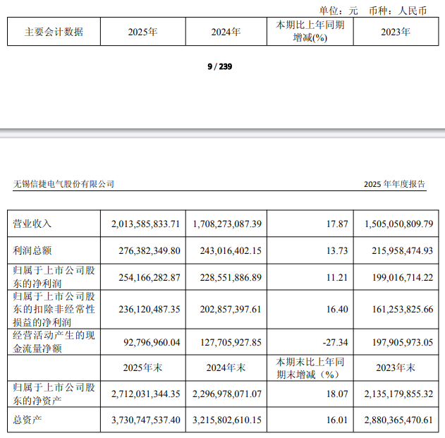 2025年,面對全球經濟復蘇乏力、上游原材料價格高企的復雜外部環境,信捷電氣憑借深厚的技術積累、完善的產品矩陣及強勁的市場拓展能力,實現了營收與利潤的雙增長。報告期內,公司實現營業總收入20.14億元,同比大幅增長17.87%;歸屬于上市公司股東的凈利潤2.54億元,同比增長11.21%;基本每股收益1.68元,同比增長2.44%。