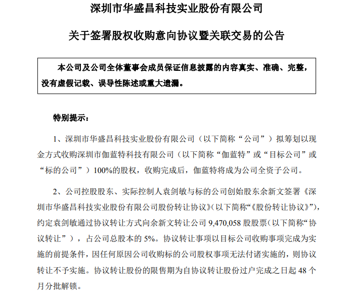 同時,公司控股股東、實際控制人袁劍敏先生與伽藍特創始股東余新文簽署了《股份轉讓協議》,約定袁劍敏先生擬通過協議轉讓方式向余新文轉讓5%的公司股份,具體以另行簽署的正式的股份轉讓協議為準。本次交易前交易對方與公司不存在關聯關系。協議轉讓完成后,余新文將持有公司5%股份。