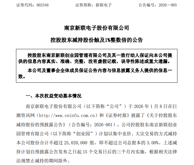 公告顯示,創業園于2026年3月2日至3月3日期間,通過集中競價方式合計減持新聯電子股份824.05萬股,占公司總股本的0.99%。本次減持價格未在公告中具體披露,但交易方式明確為集中競價交易,且不涉及資金來源(因系減持行為)。