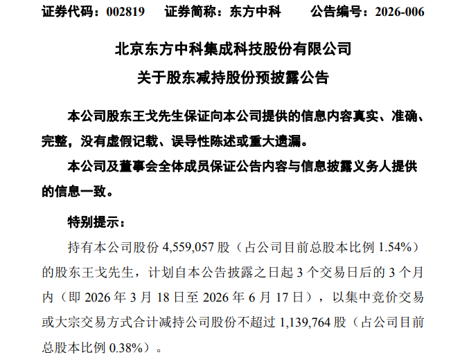 2東方中科自然人股東王戈擬減持113.98萬(wàn)股套現(xiàn)3236.93萬(wàn)元