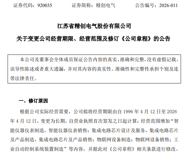 【儀表網 企業動態】3月6日,精創電氣(920035)發布公告稱,為適應公司戰略發展需要,擬對經營期限及經營范圍進行調整,并相應修訂《公司章程》相關條款。