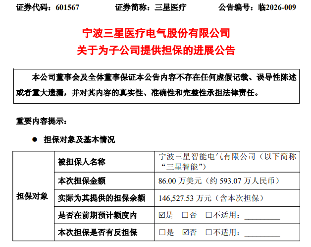 根據公告,本次擔保系三星醫療與三星智能聯合投標相關項目,依據標書履約要求推進實施。三星醫療作為擔保申請人,已向中國銀行寧波鄞州分行成功申請開立履約保函,保函金額為86萬美元,按開具當日匯率折算約合人民幣593.07萬元,擔保類型為項目履約擔保,期限自保函開立之日起至2026年12月21日止,全程覆蓋相關業務履約周期,為子公司項目交付、合同履約提供足額信用背書。?