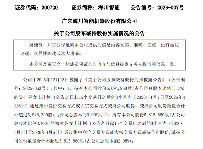 本次減持計劃最早可追溯至2025年12月13日,海川智能同步披露兩位股東的減持預披露公告(公告編號:2025-063號),嚴格遵循創業板減持監管要求履行信息披露義務。根據預披露安排,吳桂芳、鄭雪芬的減持窗口期定為2026年1月7日至4月6日,共計3個月,減持方式限定為集中競價與大宗交易組合模式,且均設定了明確的減持數量上限。?