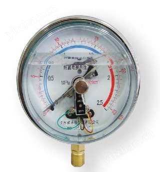 YNX系列耐震電接點壓力表具有良好的抗振性能,特別適用于有機械振動和介質脈動的工作環境適用于測量對銅及銅合金,或不銹鋼合金不起腐蝕作用氣體,液體的壓力,并在壓力達到預定值時發出信號,接通控制電路,達到自動控制的報警得目的。 在電接點壓力表裝置的電接觸信號針上,裝有可調節的磁鋼,可以增加接點吸力,加快接觸動作,從而使觸點接觸可靠,消除電弧,能有效的避免儀表由于工作環境振動或介質壓力脈動造成觸點的頻繁關斷。所以電接點壓力表具有動作可靠、使用壽命長、觸點開關功率較大等優點。