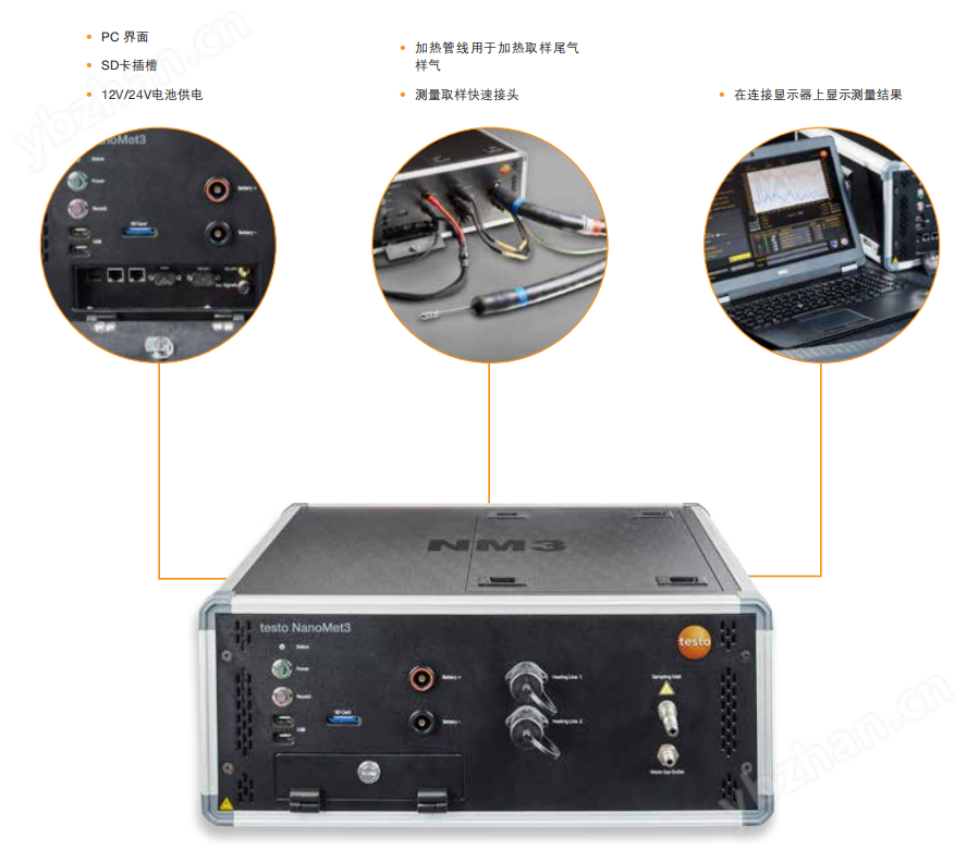 testo NanoMet3緊湊的尺寸-僅僅526x409x216mm-能夠在任何車(chē)輛的后備廂中從容地安裝。 尾氣通過(guò)連接到排氣管的加熱管線抽出,送入測(cè)量設(shè)備,記錄以下數(shù)值: