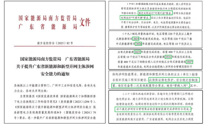 2025年8月,在國家能源局南方監(jiān)管局發(fā)布的《關(guān)于提升廣東省新能源和新型并網(wǎng)主體涉網(wǎng)安全能力的通知》中,明確提出要求新建分布式光伏項目應滿足“可觀、可測、可調(diào)、可控”要求,存量分布式光伏項目要在2027年底完成“四可”改造。