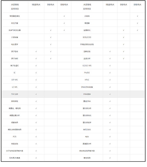 不同實驗用水需求標準對照表。在實驗室不同實驗進行的時候,我們需要用到不同的實驗用水,比如常規的器皿清洗我們只需要用到III級純水即可,而電生理學則需要用到II級純水,而離子色譜IC實驗時,我們需要用到I級超純水,很多剛剛進入實驗室的新同學還不清楚該如何區分,今天滲源純水機小編為大家整理的不同實驗用水需求標準對照表,讓你可以直接對照了解。